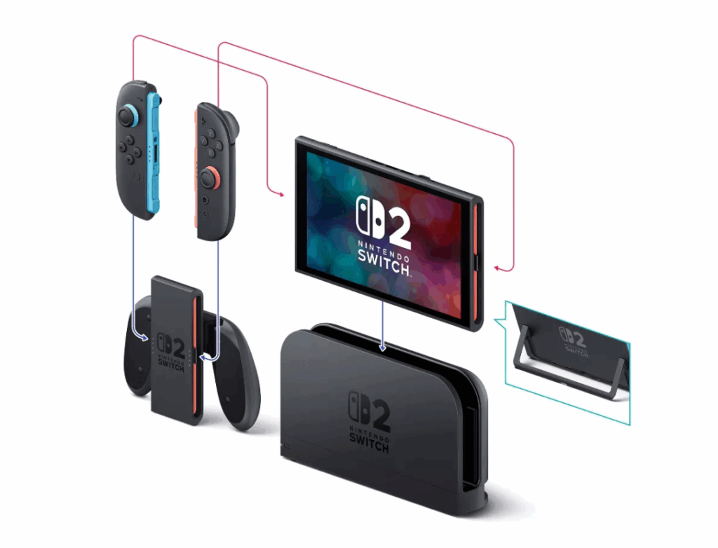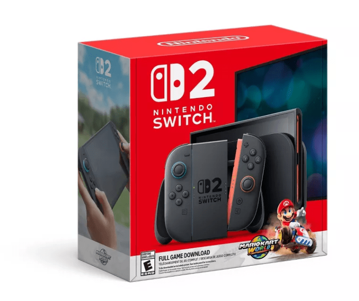 Vivid 7.9″ LCD touch screen, Joy-Con™ 2 controllers that attach, dock that supports 4k, 256GB internal storage, AC adapter, charging cable, Switch games and more.